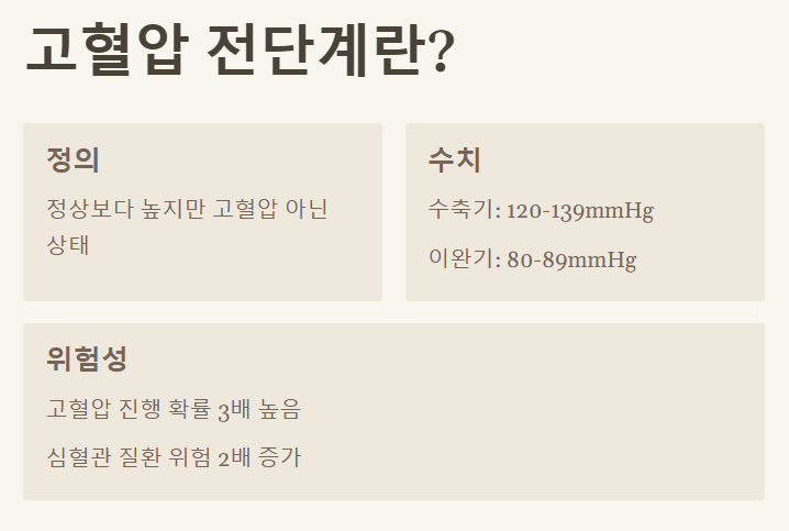 고혈압 전단계는 혈압이 정상보다는 높지만, 아직 고혈압으로 진단되지 않은 상태를 의미합니다. 그러나 이 단계를 방치하면 고혈압으로 빠르게 진행될 수 있으며, 그에 따른 심각한 합병증 위험도 높아집니다.