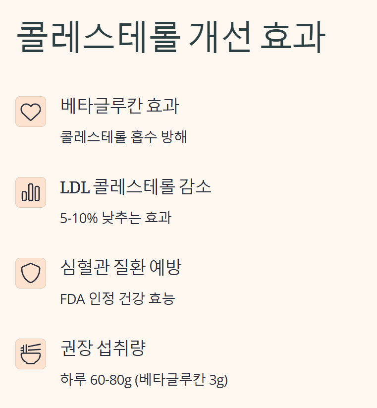 연구에 따르면, 매일 3g의 베타글루칸을 섭취하면 총 콜레스테롤과 LDL(나쁜 콜레스테롤)을 5-10% 감소시킬 수 있습니다. 이는 귀리쌀 약 60-80g에 해당하는 양입니다.
