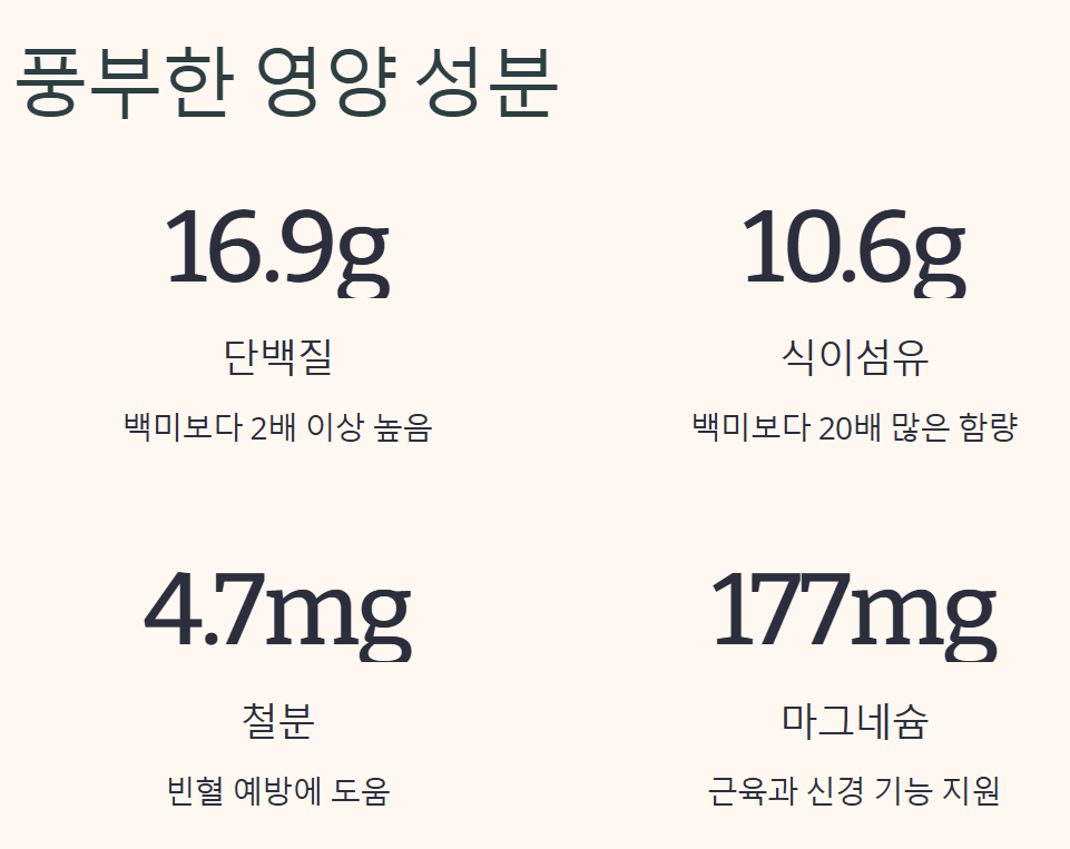 귀리쌀 100g당 단백질은 약 16.9g으로 백미(6.8g)보다 2배 이상 높습니다. 또한 식이섬유 함량은 귀리쌀이 10.6g으로 백미(0.5g)보다 무려 20배나 높습니다. 귀리쌀에는 비타민 B군, 철분, 마그네슘, 아연 등의 미네랄도 풍부하게 함유되어 있습니다.