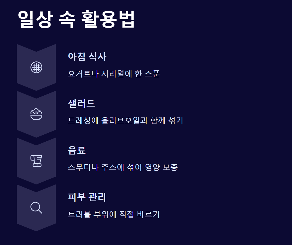 대마종자유의 풍부한 영양소와 다양한 효능을 일상생활에서 쉽게 활용할 수 있는 방법이 많습니다.