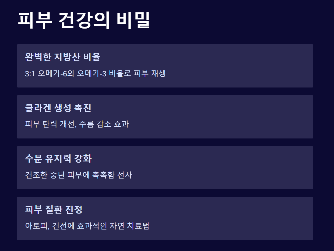 특히 40대 이후에 나타나는 건조함, 탄력 저하, 잔주름 등의 피부 노화 현상을 개선하는 데 효과적입니다. 대마종자유를 꾸준히 섭취하면 피부 속 콜라겐 생성이 촉진되어 자연스럽게 피부 탄력이 살아납니다.
