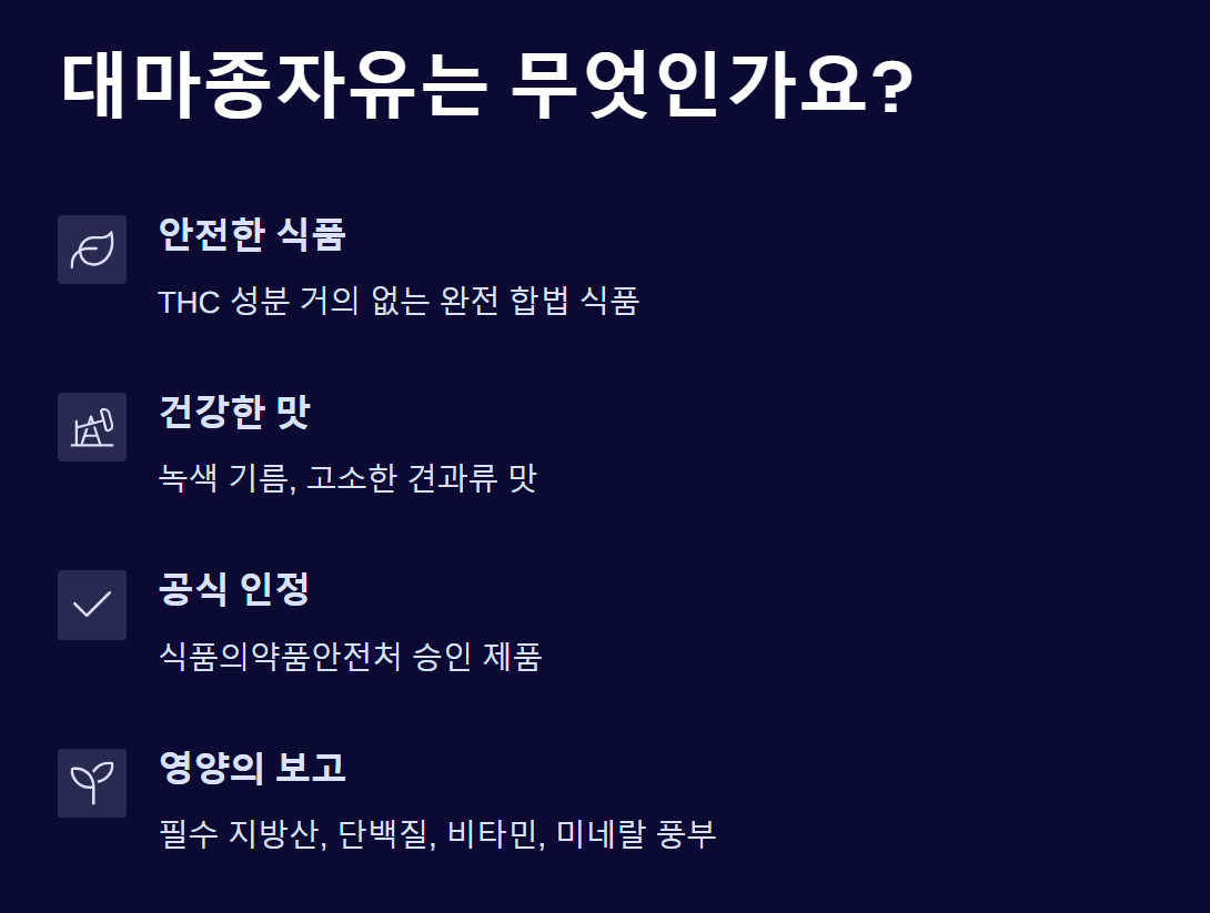 대마종자유는 대마 식물의 씨앗에서 추출한 기름으로, THC(테트라하이드로칸나비놀)이라는 마약 성분이 거의 함유되어 있지 않아 완전히 합법적이고 안전한 식품입니다. 대마종자유는 마약과는 전혀 관계가 없으니 안심하셔도 됩니다.