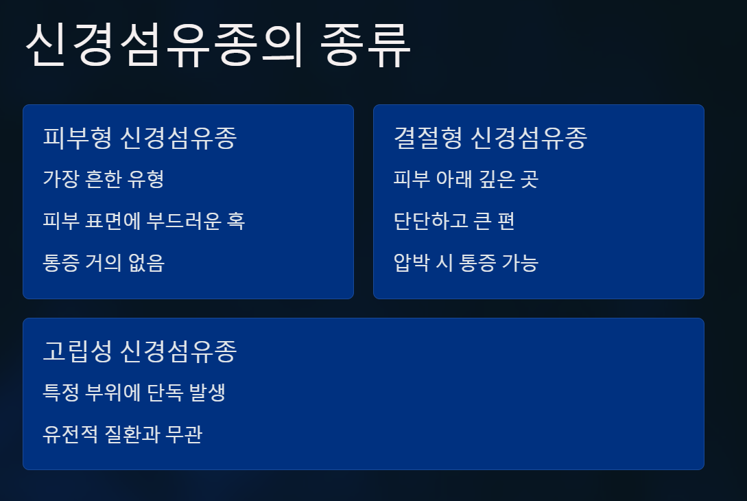 신경섬유종은 신경 조직에서 발생하는 양성 종양으로, 일반적으로 피부에 나타나는 혹 형태의 병변입니다. 신경섬유종은 크게 세 가지 종류로 나눌 수 있습니다.