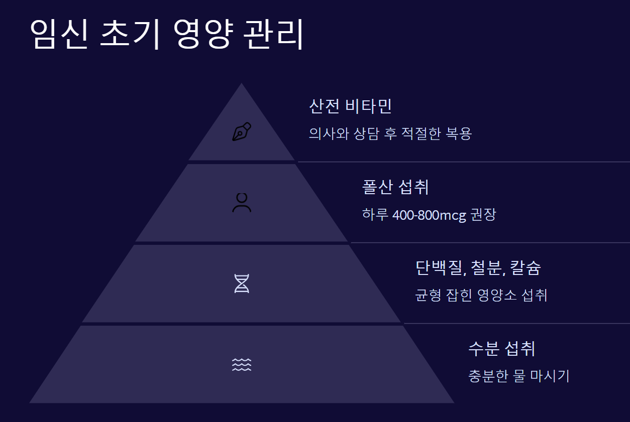 폴산(엽산) 섭취는 임신 극초기에 가장 중요한 영양소 중 하나입니다. 태아의 신경관 결함을 예방하는 데 도움을 주므로, 임신을 계획 중이거나 임신 초기에는 하루 400-800mcg의 폴산을 섭취하는 것이 권장됩니다.