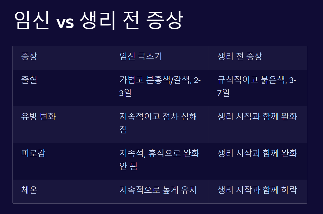 임신 극초기 증상과 생리 전 증상은 매우 유사하여 구별하기 어려울 수 있습니다. 아래 표는 두 증상의 주요 차이점을 설명합니다