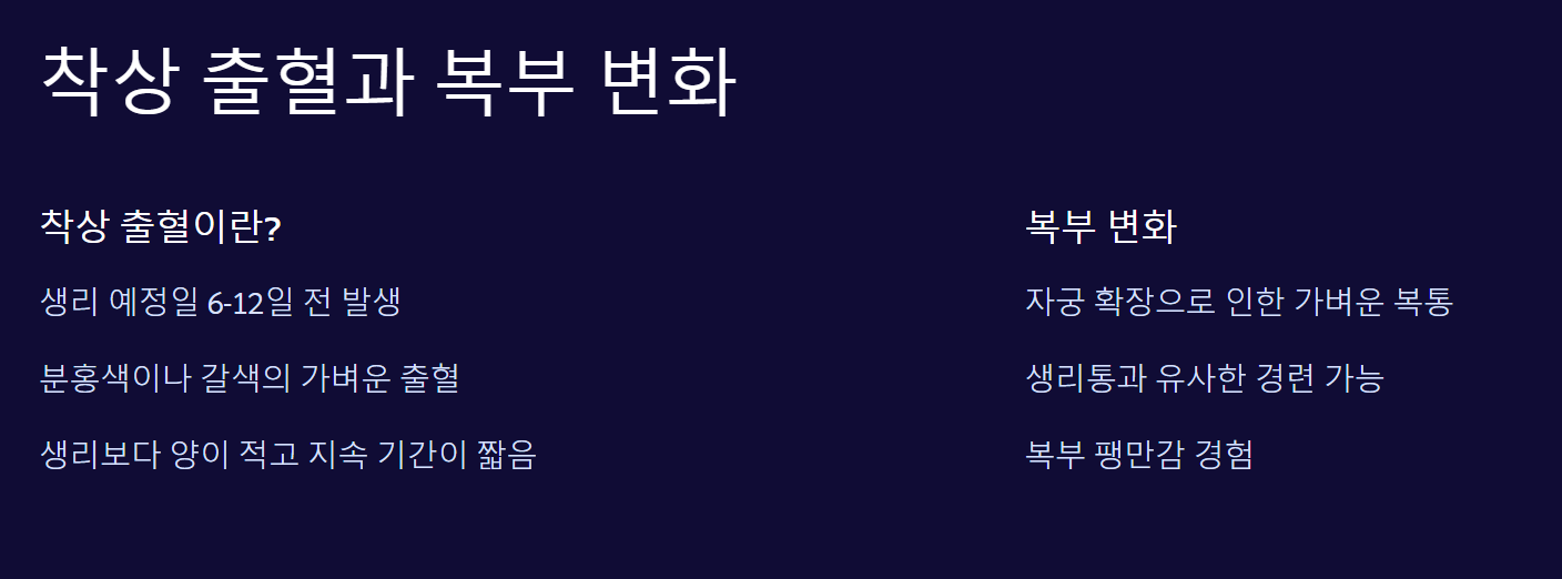 자궁이 확장되기 시작하면서 가벼운 복통이나 경련이 발생할 수 있습니다. 이는 생리통과 비슷하게 느껴질 수 있어 많은 여성들이 생리 전 증상으로 오인하기도 합니다.