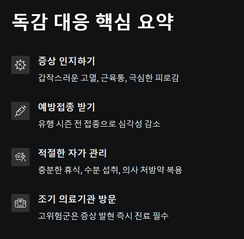 - 항바이러스제 복용: 증상 시작 48시간 이내에 시작해야 효과적입니다.